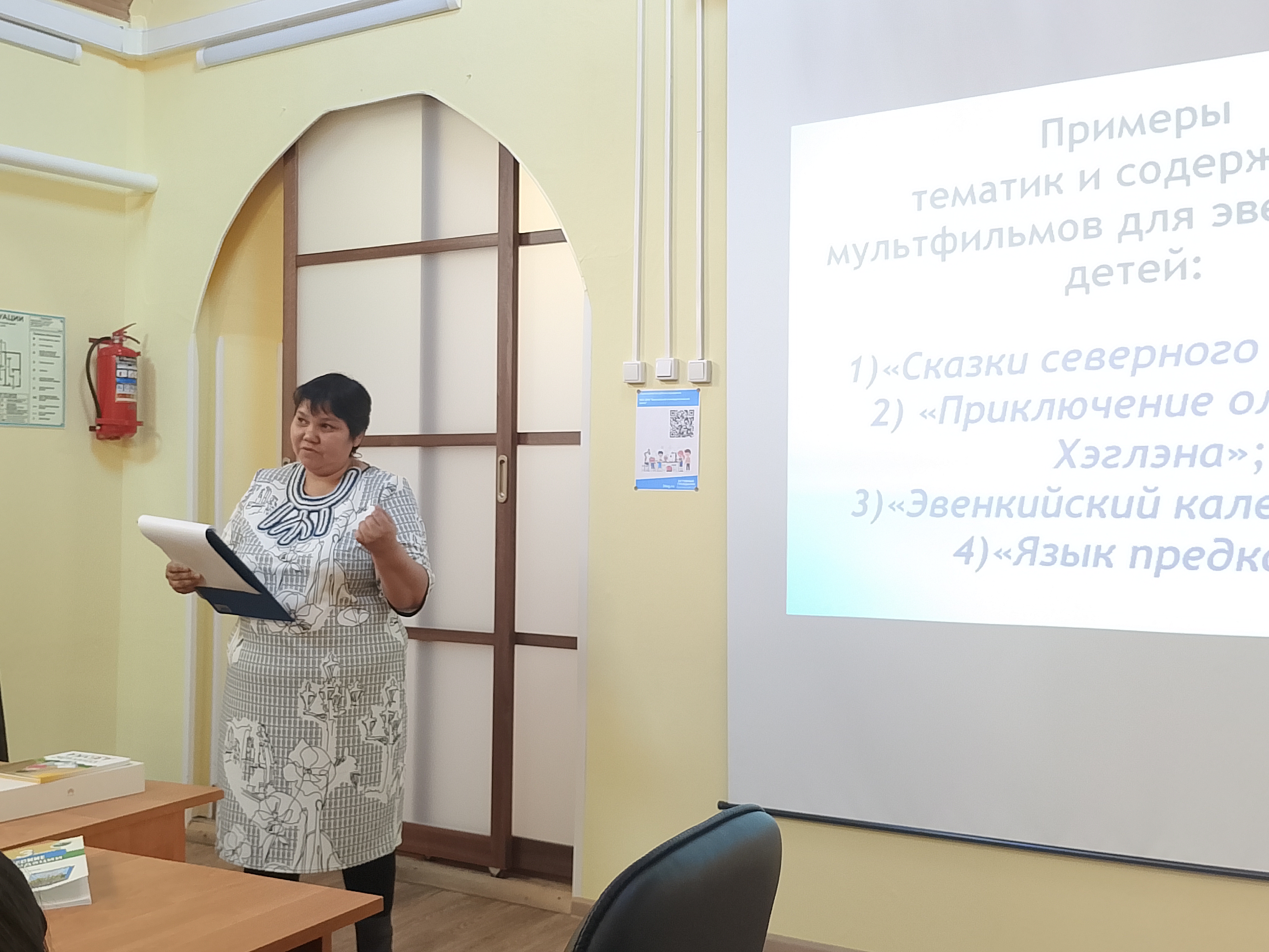 1. Доклад по теме «Погружение в языковое пространство для эффективного проведения уроков и занятий этнокультурной направленности по эвенкийскому языку и культуре в ОУ ЭМР» – руководитель ЦРОЭ Протодьяконова Н.Е.;